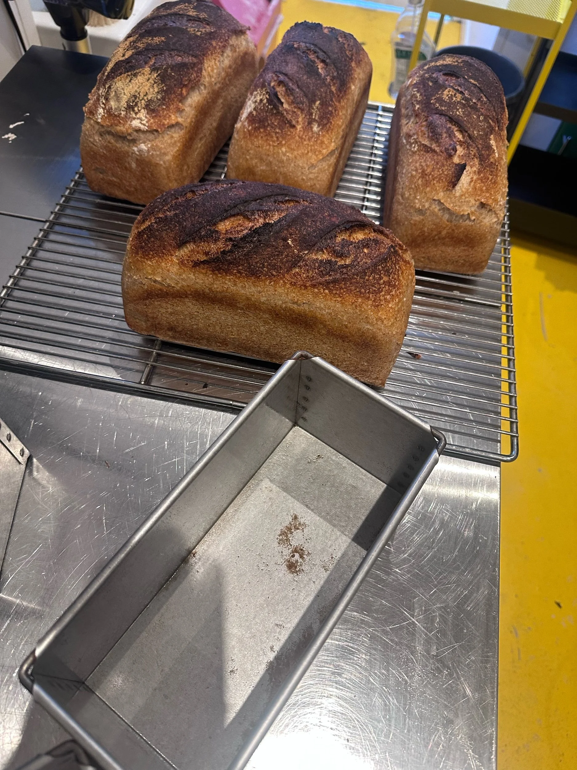 A mainly-white two-thirds white, one-third wholemeal, leavened with our sourdough starter, shaped into a tin and baked until nicely coloured on top. A lovely soft crumb, with a slightly nutty aroma from the wholemeal bran.